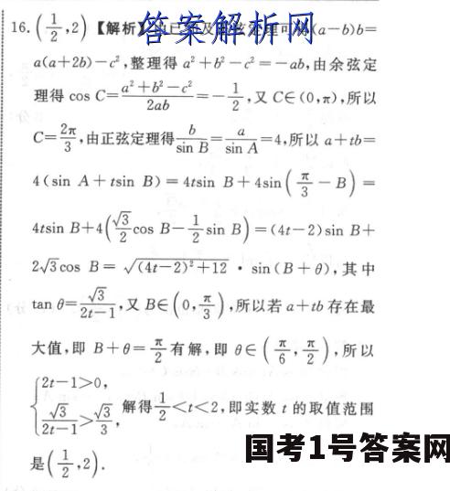 16.(分2)【解析】由已知及正弦定理可得(a一b)b=a(a+2b)-c2,整理得a2+一c2=一ab,由余弦定理得osC=心+=-号,又C∈0,,所以2abC=行,由正弦定理得品a=4,所以a十b=sin B sin A4(sin A+tsin B)=4tsin B+4sin(-B)=4sinB+4(停cosB-专sinB)=(4-2)sinB+2√3cosB=√/(4t-2)2+12·sin(B+0),其中m0=又B∈(0,音),所以若+6存在最大值,即B+0=乏有解,即9∈(若,受),所以2t-1>0,5区解得2<<2,即实数1的取值范围2t-13是(合2)