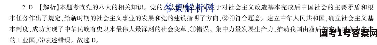 2.D【解析】本题考查党的八大的相关知识。党的八大的历史意义在于对社会主义改造基本完成后中国社会的主要矛盾和根本任务作出了规定,给新时期的社会主义事业的发展和党的建设指明了方向,②④符合题意。建立中华人民共和国,确立社会主义基本制度,成功实现了中华民族有史以来最伟大最深刻的社会变革,①错误。集中力量发展生产力,推动我国由落后的农业国变为先进的工业国,③表述错误。故选D。