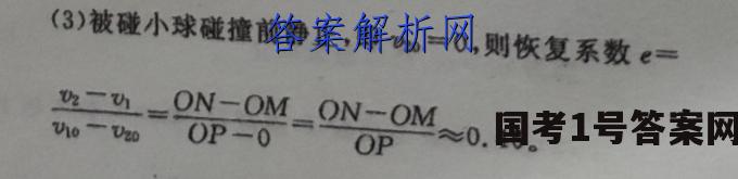 11.(1)>(1分)=(1分)(2)m·OP=m1·OM+m2·ON(3分)(3)0.46(2分)【解析】(1)为防止人射小球碰后反弹,实验要求入射小球的质量要大于被碰小球的质量,即m>m2,为保证两小球发生对心正碰,则要求两小球等大,即=r2。(2)根据平抛运动的规律可知落地高度相同,即运动时间相同设落地时间为1,则w-9。-必-心,面动量守恒的表达式为m。一m十m22,若两小球相碰前后的动量守恒,则需要验证的表达式为m1·OP=m,·OM+m2·ON。(3)被碰小球碰撞前静止,即2o=0,则恢复系数e=0-00-0N0o40.46.o一U20