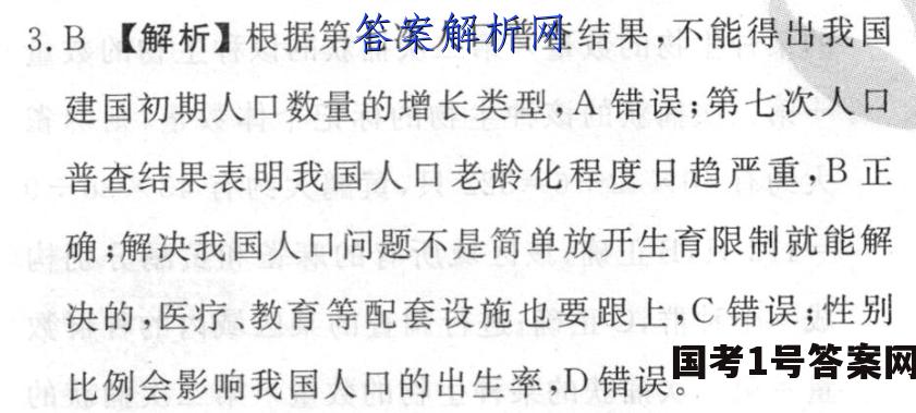 3.B【解析】根据第七次人口普查结果,不能得出我国建国初期人口数量的增长类型,A错误;第七次人口普查结果表明我国人口老龄化程度日趋严重,B正确;解决我国人口问题不是简单放开生育限制就能解决的,医疗、教育等配套设施也要跟上,C错误;性别比例会影响我国人口的出生率,D错误。