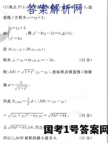 10.解:1)抛物线C:y=2px(p>0)的焦点F(号,0),准线方程为x=一号,过点M作准线的垂线,垂足为N,过点M作x轴的垂线,垂足为D,如图,依题意得MF-MN=p+IMFlcos-号,即8=p十4,解得p=4,所以抛物线C的方程为y2=8x.(8分)(2)焦点F(2,0),由题意知直线1的斜率不为0,设直线l方程为x=y十2,x=ty+2由,得y2-8ty-16=0,△>0,y2=8x设A(x1y),B(xy),则有十y2=8t,1y2=一16,(12分)则|AB|=√1十t1y一y,坐标原点到直线1的距离d=2+因此Saam=合d·AB=m-l=√(y1+yz)-4My2=V√64+64,(18分)又√/4十64≥8,当且仅当t=0时取等号,所以△AOB面积的最小值为8.(20分)