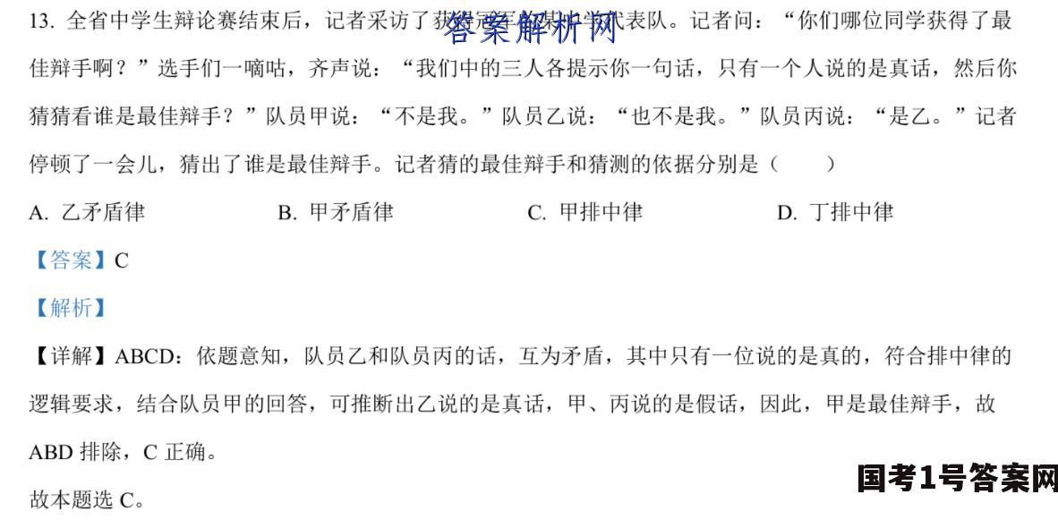 13.全省中学生辩论赛结束后,记者采访了获得冠军的某中学代表队。记者问:“你们哪位同学获得了最佳辩手啊?”选手们一嘀咕,齐声说:“我们中的三人各提示你一句话,只有一个人说的是真话,然后你猜猜看谁是最佳辩手?”队员甲说:“不是我。”队员乙说:“也不是我。”队员丙说:“是乙。”记者停顿了一会儿,猜出了谁是最佳辩手。记者猜的最佳辩手和猜测的依据分别是(A.乙矛盾律B.甲矛盾律C.甲排中律D.丁排中律【答案】C【解析】【详解】ABCD:依题意知,队员乙和队员丙的话,互为矛盾,其中只有一位说的是真的,符合排中律的逻辑要求,结合队员甲的回答,可推断出乙说的是真话,甲、丙说的是假话,因此,甲是最佳辩手,故ABD排除,C正确。故本题选C。