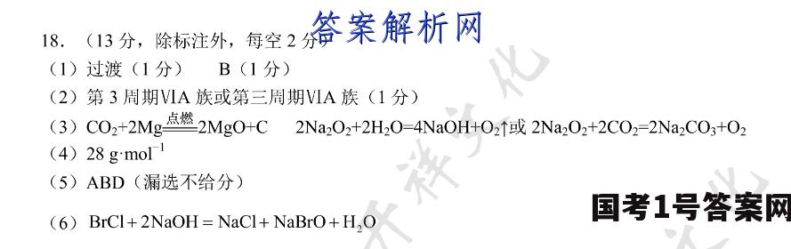 18.(13分,除标注外,每空2分)(1)过渡(1分)B(1分)(2)第3周期VlA族或第三周期V1A族(1分)(3)C02+2Mg点燃2Mg0+C2Na202+2H2O=4NaOH+O2 2Na202+2CO2=2Na2CO3+O2(4)28gmolΓ1(5)ABD(漏选不给分)(6)BrCl+2NaOH NaCl+NaBrO+HO