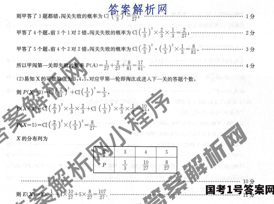 19.解:(1)设“甲闯第一关即失败”为事件A,因为甲答对每个题的概率均为子,所以甲答错每个题的概率均为子,则甲答了3题都错,闯关失败的概率为©(号)'-》1分甲答了4个题,前3个1对2错,闯关失败的概率为C(号))×号×号=品2分甲答了5个题,前4个2对2错,闯关失败的概率为C(号)°·(号)》'×号=景3分所以甲阿第-关即尖PUA)=品+号+品-品4分(2)易知X的可能取值为3,4,5,对应甲第一轮即淘汰或进入下一关的答题个数,别酸沿a)广-x好C(号)‘×号×号+C(号)‘×x=5)=c(号)'×(号)=8程序X的分布列为解析网34513027解析网210分则E(=310+5X81072772712分