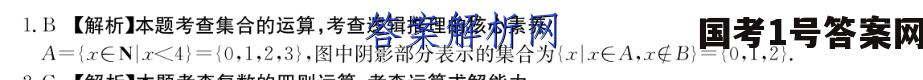 1.B【解析】本题考查集合的运算,考查逻辑推理的核心素养A={x∈Nx<4}={0,1,2,3},图中阴影部分表示的集合为{xx∈A,xB}={0,1,2}.