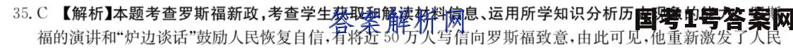 35.C【解析】本题考查罗斯福新政,考查学生获取和解读材料信息、运用所学知识分析历史现象的能力。罗斯福的演讲和“炉边谈话”鼓励人民恢复自信,有将近50万人写信向罗斯福致意,由此可见,他重新激发了人民的希望与勇气,故选C项;罗斯福的演讲和改革并未消除资本主义的基本矛盾,故排除A项;材料未涉及改革的进程和具体内容,故排除B项;新政只是建立了社会保障制度而不是健全了这一制度,故排除D项。