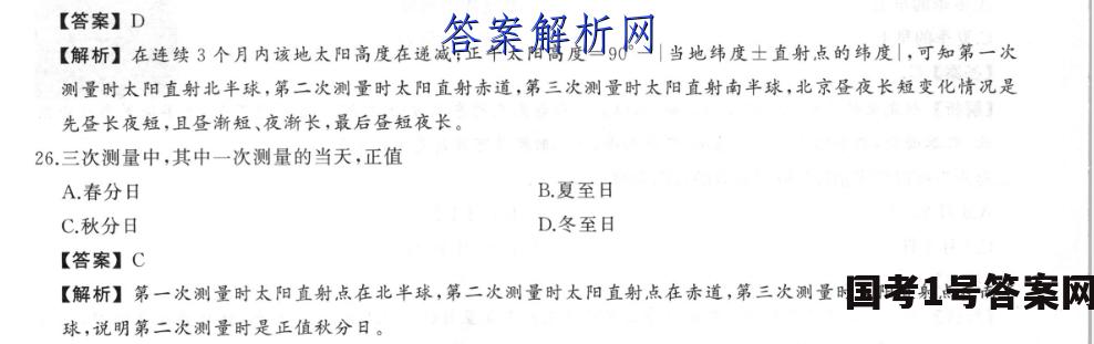 【答案】D【解析】在连续3个月内该地太阳高度在递减;正午太阳高度=90°一|当地纬度士直射点的纬度|,可知第一次测量时太阳直射北半球,第二次测量时太阳直射赤道,第三次测量时太阳直射南半球,北京昼夜长短变化情况是先昼长夜短,且昼渐短、夜渐长,最后昼短夜长。26.三次测量中,其中一次测量的当天,正值A.春分日B.夏至日C.秋分日D.冬至日【答案】C【解析】第一次测量时太阳直射点在北半球,第二次测量时太阳直射点在赤道,第三次测量时太阳直射点在南半球,说明第二次测量时是正值秋分日。