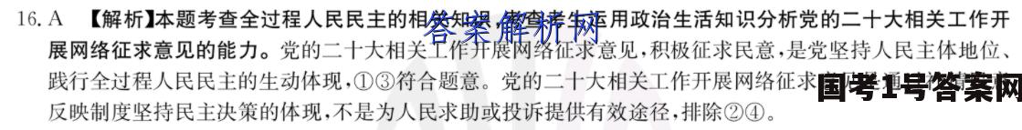 16.A【解析】本题考查全过程人民民主的相关知识,考查考生运用政治生活知识分析党的二十大相关工作开展网络征求意见的能力。党的二十大相关工作开展网络征求意见,积极征求民意,是党坚持人民主体地位、践行全过程人民民主的生动体现,①③符合题意。党的二十大相关工作开展网络征求意见是通过社情民意反映制度坚持民主决策的体现,不是为人民求助或投诉提供有效途径,排除②④。