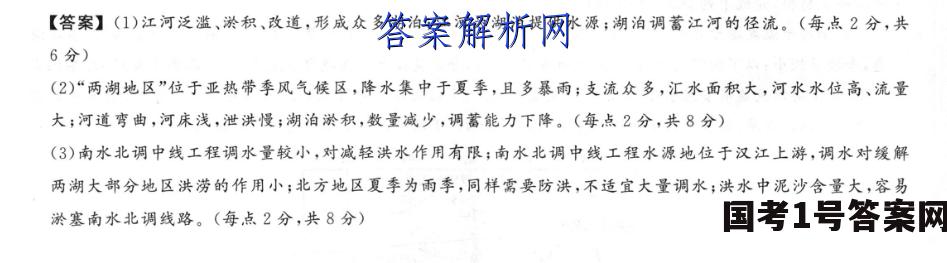 【答案】(1)江河泛滥、淤积、改道,形成众多湖泊;江河为湖泊提供水源:湖泊调蓄江河的径流。(每点2分,共6分)(2)“两湖地区”位于亚热带季风气候区,降水集中于夏季,且多暴雨;支流众多,汇水面积大,河水水位高、流量大;河道弯曲,河床浅,泄洪慢;湖泊淤积,数量减少,调蓄能力下降。(每点2分,共8分)(3)南水北调中线工程调水量较小,对减轻洪水作用有限;南水北调中线工程水源地位于汉江上游,调水对缓解两湖大部分地区洪涝的作用小;北方地区夏季为雨季,同样需要防洪,不适宜大量调水;洪水中泥沙含量大,容易淤塞南水北调线路。(每点2分,共8分)