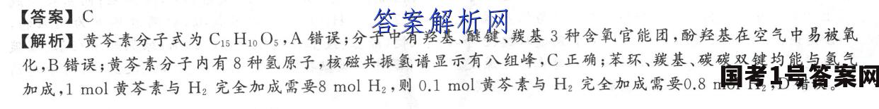 【答案】C【解析】黄芩素分子式为C15H10O5,A错误;分子中有羟基、醚键、羰基3种含氧官能团,酚羟基在空气中易被氧化,B错误;黄芩素分子内有8种氢原子,核磁共振氢谱显示有八组峰,C正确;苯环、羰基、碳碳双键均能与氢气加成,1mol黄芩素与H2完全加成需要8molH2,则0.1mol黄芩素与H2完全加成需要0.8molH2,D错误。