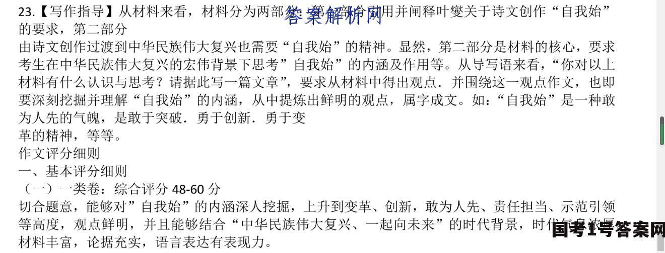 23.【写作指导】从材料来看,材料分为两部分:第一部分引用并闸释叶燮关于诗文创作“自我始”的要求,第二部分由诗文创作过渡到中华民族伟大复兴也需要“自我始”的精神。显然,第二部分是材料的核心,要求考生在中华民族伟大复兴的宏伟背景下思考”自我始”的内涵及作用等。从导写语来看,“你对以上材料有什么认识与思考?请据此写一篇文章”,要求从材料中得出观点.并围绕这一观点作文,也即要深刻挖掘并理解“自我始”的内涵,从中提炼出鲜明的观点,属字成文。如:“自我始”是一种敢为人先的气魄,是敢于突破.勇于创新.勇于变革的精神,等等。作文评分细则一、基本评分细则(一)一类卷:综合评分48-60分切合题意,能够对”自我始”的内涵深人挖掘,上升到变革、创新,敢为人先、责任担当、示范引领等高度,观点鲜明,并且能够结合“中华民族伟大复兴、一起向未来”的时代背景,时代气息浓厚。材料丰富,论据充实,语言表达有表现力。(二)二类卷:综合评分42-47分符合题意,能够对”自我始"的内涌深人挖掘,上升到变革,创新.敢为人先,责任担当。示范引领等高度,观点鲜明,但在结合时代背景方面做得不够,时代气息不够浓厚。材料较为丰富,论据较为充实,语言表达通顺,结构完整。语文第3页·(共4页)