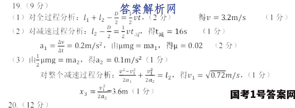 19.(9分)1)对全过程分析:41+2-号=t,(2分)得v=3.2m/s(1分》2)对减速过程分析:2-2=t得t戏=16s22(1分)a1==0.2m/s2,由umg=ma1,得μ=0.02(2分)At(3)由5μmg=ma2,得a2=0.1m/s2(1分)对整个减速过程分析:_近+生=l2,得v1=V0.72m/s,(1分)2a12a2x3=-3.6m(1分)2220.(12分)