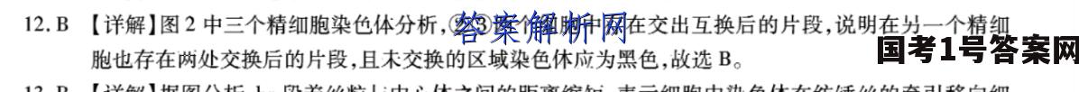 12.B【详解】图2中三个精细胞染色体分析,②③两个细胞中存在交出互换后的片段,说明在为一个精细胞也存在两处交换后的片段,且木交换的区域染色休应为黑色,故选B。