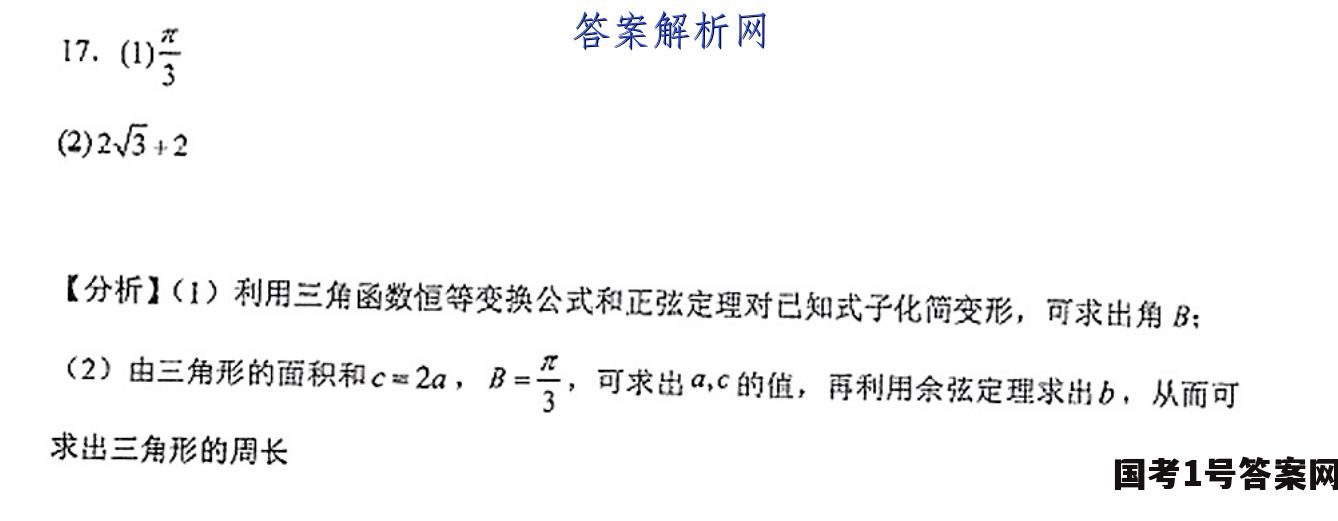 (2)25+2【分析】(1)利用三角图数恒等变换公式和正弦定理对已知式子化简变形,可求出角B:(2)由三角形的面积和c=2a,B=号,可求品Q,c的值,再利用余弦定理求出b,从而可求出三角形的周长(1)cosB(a-bsinc)=bsin BcosC,.3acos B-bcos Bsin C=bsin BcosC.'.acos B=bsin BcosC+bcos Bsin C,,.∴V3 a cos B=bsin(B+C)=bsinA由正弦定理可得:3 sinAcos B=sinBsinA,:sinA≠0,5cosB=sin8,六tam8=v5,:8e(0,):B=号2y:16cC的面积为25,ca8-e=25,得c-号c=2,2a-骨4325a>0,.a=9453-C=2a=,由余弦定理可得3b2=a2+c2-2accos B=+462x25×45x=4,yb>0,b=2,三角形的展长-2×33332为a+b+c=23=25+2