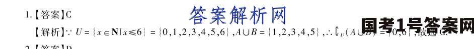1.【答案】C【解析】.U={x∈NIx≤6}={0,1,2,3,4,5,6},AUB={1,2,3,4,5},∴.C(AUB)={0,6},故选C.【、】1
