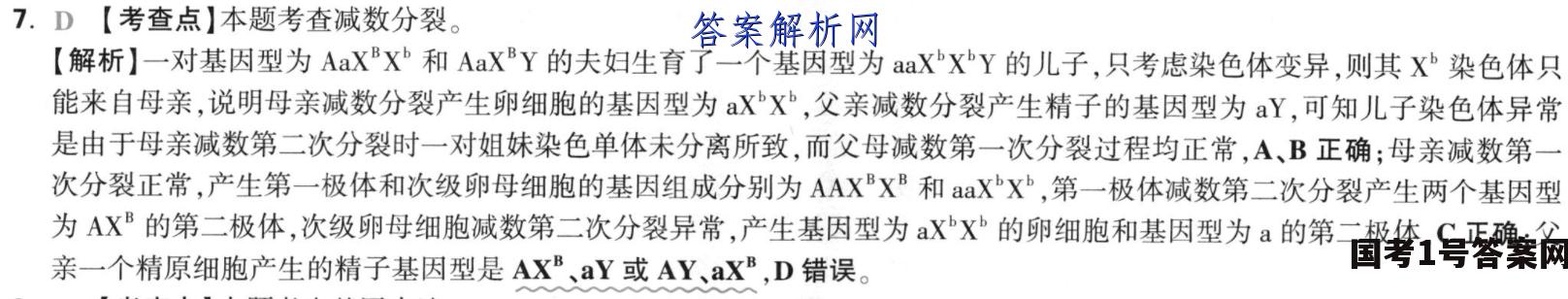 7.D【考查点】本题考查减数分裂。【解析】一对基因型为AaXX和AaXBY的夫妇生育了一个基因型为aaXXY的儿子,只考虑染色体变异,则其X染色体只能来自母亲,说明母亲减数分裂产生卵细胞的基因型为aXX,父亲减数分裂产生精子的基因型为aY,可知儿子染色体异常是由于母亲减数第二次分裂时一对姐妹染色单体未分离所致,而父母减数第一次分裂过程均正常,A、B正确:母亲减数第次分裂正常,产生第一极体和次级卵母细胞的基因组成分别为AAXXB和aXX,第一极体减数第二次分裂产生两个基因型为AXB的第二极体,次级卵母细胞减数第二次分裂异常,产生基因型为XX的卵细胞和基因型为a的第二极体,C正确;父亲一个精原细胞产生的精子基因型是AX、aY或AY、aX,D错误。