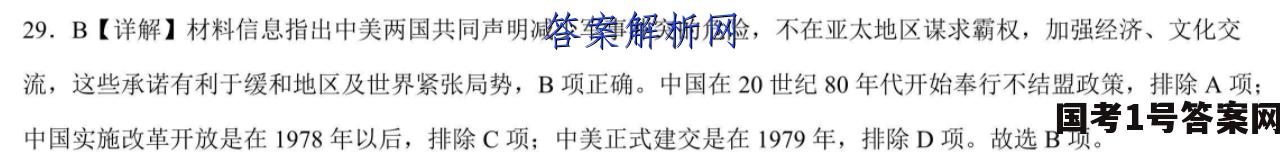 29.B【详解】材料信息指出中美两国共同声明减少军事冲突的危险,不在亚太地区谋求霸权,加强经济、文化交流,这些承诺有利于缓和地区及世界紧张局势,B项正确。中国在20世纪80年代开始奉行不结盟政策,排除A项:中国实施改革开放是在1978年以后,排除C项;中美正式建交是在1979年,排除D项。故选B项。