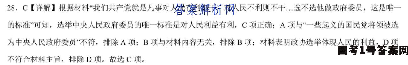 28.C【详解】根据材料“我们共产党就是凡事对人民有利则干,对人民不利则不干.选不选他做政府委员,这是唯一的标准”可知,选举中央人民政府委员的唯一标准是对人民利益有利,C项正确:A项与“一些起义的国民党将领被选为中央人民政府委员”不符,排除A项;B项与材料内容无关,排除B项;材料表明政协选举体现人民的利益,D项不符合材料主旨,排除D项。故选C项。
