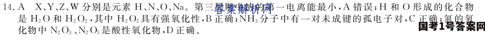 14.AX、Y、Z、W分别是元素H、N、O、N。第三周期中钠的第一电离能最小,A错误;H和O形成的化合物是H2O和H2O2,其中H2O2具有强氧化性,B正确;NH3分子中有一对未成键的孤电子对,C正确;氮的氧化物中N2O3、N2O5是酸性氧化物,D正确。
