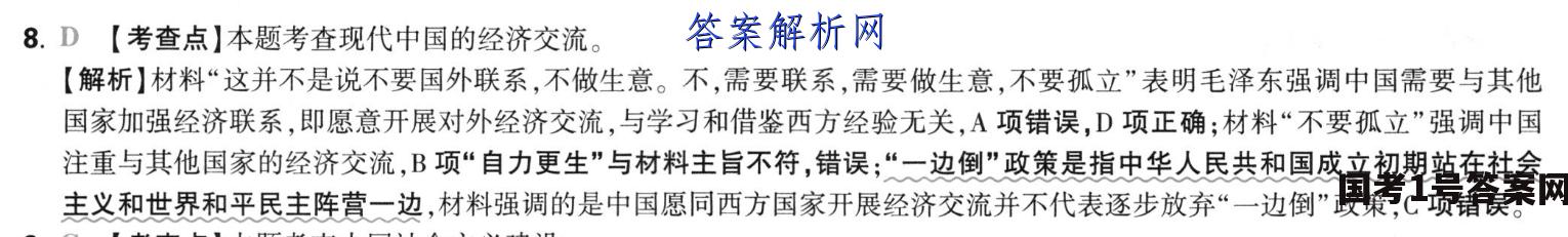 8.D【考查点】本题考查现代中国的经济交流【解析】材料“这并不是说不要国外联系,不做生意。不,需要联系,需要做生意,不要孤立”表明毛主席强调中国需要与其他国家加强经济联系,即愿意开展对外经济交流,与学习和借鉴西方经验无关,A项错误,D项正确:材料“不要孤立”强调中国注重与其他国家的经济交流,B项“自力更生”与材料主旨不符,错误;“一边倒”政策是指中华人民共和国成立初期站在社会主义和世界和平民主阵营一边,材料强调的是中国愿同西方国家开展经济交流并不代表逐步放弃“一边倒”政策,C项错误。
