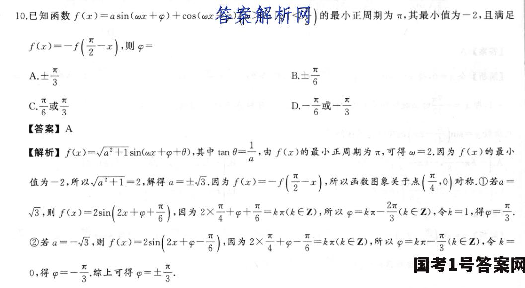 10.已知函数f(x)=asin(wr十9)+cos(wx十p)(如>0,g<)的最小正周期为,其最小值为-2,且满足f(x)=-f(-x)则gA士号B.±6c后或写D.-或一3【答案】A【解析】fx)=√a中sin(ar十p十9,其中an0=】,由f(x)的最小正周期为元,可得u=2,因为f(x)的最小Q值为-2,所以Wa2+=2,解得a=士5.因为f(x)=一f(-x所以函数图象关于点(0)对称.①若a5,则fx)=2sin2x十9十),因为2X+9+吾=x∈Z,所以p=kx-(k∈zD,令k=1,得9=吾②若a=-5,则f(x)=2sin(2x十9-若),固为2×十9-吾=灰x(k∈2),所以9=kx-g(k∈Z),令k=0,得9=-行综上可得g=土行