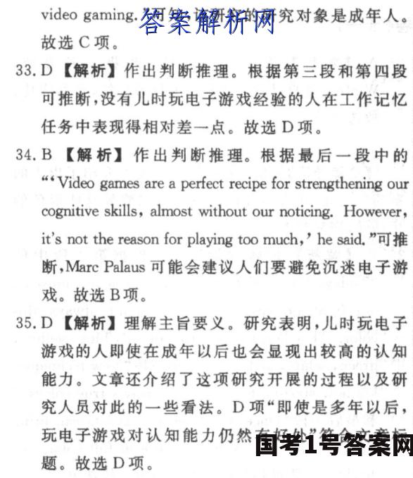 D【语篇导读】这是一篇说明文。文章主要说明了研究表明,儿时玩电子游戏的人即使在成年以后也会显现出较高的认知能力。文章还介绍了这项研究开展的过程以及研究人员对此的一些看法。32.C【解析】理解具体信息。根据第二段中的“Thestudy involved 27 people between the ages of 18 and40 with and without any kind of experience withvideo gaming.”可知,该研究的研究对象是成年人。故选C项。33.D【解析】作出判断推理。根据第三段和第四段可推断,没有儿时玩电子游戏经验的人在工作记忆任务中表现得相对差一点。故选D项。34.B【解析】作出判断推理。根据最后一段中的"Video games are a perfect recipe for strengthening ourcognitive skills,almost without our noticing.However,it's not the reason for playing too much,’he said,”可推断,Marc Palaus可能会建议人们要避免沉迷电子游戏。故选B项。35.D【解析】理解主旨要义。研究表明,儿时玩电子游戏的人即使在成年以后也会显现出较高的认知能力。文章还介绍了这项研究开展的过程以及研究人员对此的一些看法。D项“即使是多年以后,玩电子游戏对认知能力仍然有好处”符合文章标题。故选D项。