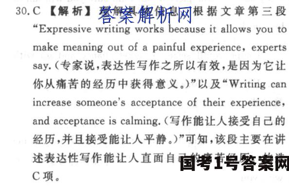 C【语篇导读】这是一篇说明文。主要讲述表达性写作对于治疗创伤的好处。28.A【解析】作出判断推理。文章第一段主要讲述了Yanatha Desouvre在父亲被送往医院后感到非常的痛苦。然而,通过写作,Yanatha直面了自己的恐惧,缓解了自己的痛苦。通过这一事例引入文章的主旨一写作能够帮助缓解痛苦和疾病。因此,第一段的作用是引人话题。故选A项。29.B【解析】理解具体信息。根据文章第二段"James Pennebaker,a psychology professor,saysthat studies have looked at the potential benefits ofexpressive writing and found that it can strengthenthe immune system”(心理学教授JamesPennebaker表示,已经着手研究表达性写作的潜在好处,并发现它可以增强免疫系统)以及“It canalso help reduce chronic pain(慢性痛),andimprove mood,sleep,and memory.And it mayeven help reduce symptoms of depression andPTSD.(它也可以帮助减少慢性疼痛,改善情绪、睡眠、记忆。它甚至可以帮助减轻抑郁和创伤后应激障碍的症状。)”可知,第二段主要在讲述表达写作的好处。故选B项。30.C【解析】理解具体信息。根据文章第三段"Expressive writing works because it allows you tomake meaning out of a painful experience,expertssay.(专家说,表达性写作之所以有效,是因为它让你从痛苦的经历中获得意义。)”以及“Writing canincrease someone's acceptance of their experience,and acceptance is calming.(写作能让人接受自己的经历,并且接受能让人平静。)”可知,该段主要在讲述表达性写作能让人直面自己的痛苦经历。故选C项。31.D【解析】作出判断推理。该篇文章属于说明文,主要讲述了表达性写作对于缓解痛苦,减轻创伤所带来痛苦经历的积极作用;同时出现了医学类的词汇traumatic(创伤)experience、PTSD(创伤后应激障碍)、chronic pain(慢性痛)等词汇。所以,该文章应该选自于医学杂志。故选D项。