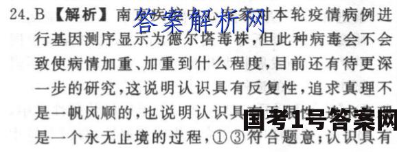 24.B【解析】南京疾控中心专家对本轮疫情病例进行基因测序显示为德尔塔毒株,但此种病毒会不会致使病情加重、加重到什么程度,目前还有待更深一步的研究,这说明认识具有反复性,追求真理不是一帆风顺的,也说明认识具有无限性,追求真理是一个永无止境的过程,①③符合题意,认识具有上升性,是一种波浪式的前进和螺旋式的上升过程,而不是圆圈式的循环运动,②说法错误;思维与存在具有同一性,但思维有正确和错误之分,未必是对存在的正确反映,④说法错误。