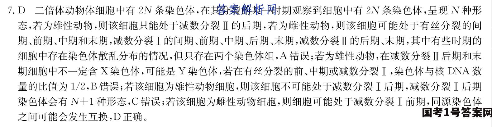 7.D二倍体动物体细胞中有2N条染色体,在其分裂的某一时期观察到细胞中有2N条染色体,呈现N种形态,若为雄性动物,则该细胞只能处于减数分裂Ⅱ的后期,若为雌性动物,则该细胞可能处于有丝分裂的间期、前期、中期和末期,减数分裂工的间期、前期、中期、后期、末期,减数分裂Ⅱ的后期、末期,其中有些时期的细胞中存在染色体散乱分布的情况,但只存在两个染色体组,A错误;若为雄性动物,在减数分裂Ⅱ后期和末期细胞中不一定含X染色体,可能是Y染色体,若在有丝分裂的前、中期或减数分裂I,染色体与核DNA数量的比值为1/2,B错误;若该细胞为雄性动物细胞,则该细胞不可能处于减数分裂I后期,减数分裂I后期染色体会有V十1种形态,C错误;若该细胞为雌性动物细胞,则细胞可能处于减数分裂I前期,同源染色体之间可能会发生互换,D正确。