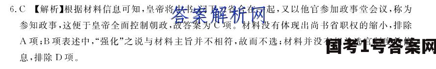 6.C【解析】根据材料信息可知,皇帝将中书、门下二省合在一起,又以他官参加政事堂会议,称为参知政事,这便于皇帝全面控制朝政,故答案为C项。材料没有体现出尚书省职权的缩小,排除A项;B项表述中,“强化”之说与材料主旨并不相符,故而不选;材料并没有相关选官制度的信息,排除D项。