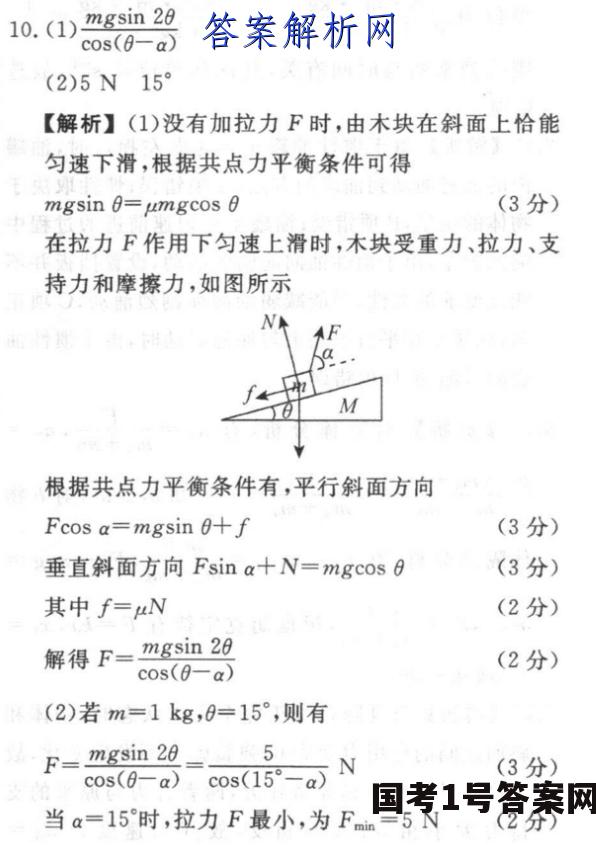 10.(1)mgsin 20cos(0-a)(2)5N15°【解析】(1)没有加拉力F时,由木块在斜面上恰能匀速下滑,根据共点力平衡条件可得mgsin 0=umgcos 0(3分)在拉力F作用下匀速上滑时,木块受重力、拉力、支持力和摩擦力,如图所示NM根据共点力平衡条件有,平行斜面方向Fcos a=mgsin 0+f(3分)》垂直斜面方向Fsin a+N=mgcos日(3分)其中f=N(2分)》解得F=ngsin20c0s(0-a)(2分)(2)若m=1kg,0=15°,则有F=mgsin 205c0s(0-a)-cos(15°-a)N(3分)当a=15时,拉力F最小,为Fmin=5N(2分)