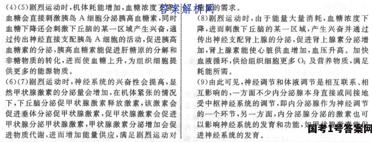 19.(18分,每空2分)》(1)乳酸(2)HCO3、HPO(3)肾小管、集合管(4)神经递质(5)更多能源物质(6)促甲状腺激素(TSH)(7)物质的氧化分解(8)更多O2及营养物质(9)影响神经系统的发育和功能【解析】(1)(2)剧烈运动时,机体耗能增加,除了有氧呼吸之外,机体还会通过无氧呼吸供能,人体无氧呼吸的产物是乳酸,乳酸进入内环境之后会与血浆中的缓冲物质结合,如与碳酸氢钠反应,生成乳酸钠和碳酸,碳酸分解成二氧化碳和水,排出体外,主要的缓冲离子有HCO、HPO。(3)剧烈运动时,机体会大量排汗,导致细胞外液渗透压上升,会刺激下丘脑的渗透压感受器,进而导致下丘脑的神经分泌细胞分泌抗利尿激素,通过垂体释放,使肾小管和集合管对水分的重吸收能力增强,尿量减少,维持渗透压稳定。(4)(5)剧烈运动时,机体耗能增加,血糖浓度下降,能量的需求。血糖会直接刺激胰岛A细胞分泌胰高血糖素,同时(8)剧烈运动时,由于能量大量消耗,血糖浓度下血糖下降还会刺激下丘脑的某一区域产生兴奋,通降,进而刺激下丘脑的某一区域,产生兴奋并通过过传出神经直接支配胰岛A细胞的活动,促进胰高传出神经支配肾上腺的分泌,促进肾上腺素分泌增血糖素的分泌,胰高血糖素能促进肝糖原的分解和加,肾上腺素能使心脏供血增加,血压升高。加快非糖物质的转化,进而使血糖上升,为组织细胞提血液循环,供给组织细胞更多O2及营养物质,满足供更多的能源物质。耗能所需。(6)(7)剧烈运动时,神经系统的兴奋性会提高,显(9)由此可见,神经调节和体液调节是相互联系、相然甲状腺激素的分泌量会增加,在机体紧张的情况互影响的,一方面不少内分泌腺本身直接或间接地下,下丘脑分泌促甲状腺激素释放激素,该激素会受中枢神经系统的调节,即内分泌腺作为神经调节促进垂体分泌促甲状腺激素,促甲状腺激素会促进的一个环节,另一方面,内分泌腺分泌的激素也可甲状腺分泌甲状腺激素,甲状腺激素分泌增加会促以影响神经系统的发育和功能,如甲状腺激素能促进物质代谢,进而增加能量供应,满足剧烈运动对进神经系统的发育。