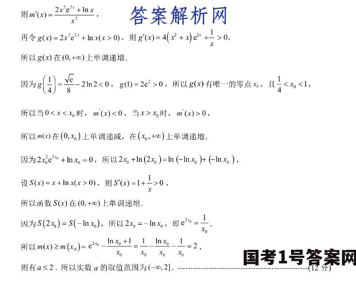 121.(1)解:f(x)=-+a,x>0,当a≥0时,f"(x)>0恒成立,所以f(x)在(0,+o)上单调递增.又f(e-)=ae1-a-l+1=a(e1-1)s0,f0=a+1>0,所以此时f(x)在(0,+o)上仅有一个零点,符合题意:当a<0时,令f)>0,解得0 -1似四君上超酸(分小上作要使在@+四)上仅有一个零点,则必有f》-0,解得a=-1综上,当a≥0或a=-1时,f(x)在(0,+∞)上仅有一个零点.------------(5分)(2)因为f(x)=ax+lnx+1,所以对任意的x>0,f(x)≤xe2x恒成立,等价于a≤c2_血x+1在(0,+0)上恒成立.令m(x)=e2x-lnr+l(x>0),则只需a≤m(x)min即可,则m'(x)=2x2e2+Inx再令g()=2re2"+nxx>0,则g)=4(+e+>0.所以g(x)在(0,+D)上单调递增.因为g日》-长-n2x0,50-200,所以的有喻-的零点5,且时气 x,时,m(x)>0,所以m(x)在(0,x)上单调递减,在(x,+o)上单调递增.因为2xe2s+n=0,所以2x+lh(2x)=n(-lnx+(-lnx),设S()=x+1nx(x>0),则S'(w)=1+>0,所以函数S(x)在(0,+0)上单调递增.因为S(2x)=S(-血x),所以2x,=-ln,即e=所以m)≥mk,)=e-h+-1n五-士=2,XoXo Xo xo则有a≤2.所以实数a的取值范围为(,2].-(12分)