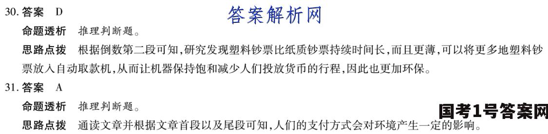 文章大意:本文是一篇说明文。文章主要通过分析钱币的生产、运输、流通以及销毁等环节说明人们的支付方式会对环境产生影响。28.答案B命题透析细节理解题。思路点拨根据第二段中的“Then the metal is shaped into disks known as coin blanks.”可知,这些“disks”就是空白硬币,会被送到铸币厂通过不同的工艺制成硬币。29.答案C命题透析细节理解题。思路点拨根据第二段首句可知,研究人员是通过研究一便士的生命周期来衡量货币对环境产生的影响。30.答案D命题透析推理判断题。思路点拨根据倒数第二段可知,研究发现塑料钞票比纸质钞票持续时间长,而且更薄,可以将更多地塑料钞票放入自动取款机,从而让机器保持饱和减少人们投放货币的行程,因此也更加环保。31.答案A命题透析推理判断题。思路点拨通读文章并根据文章首段以及尾段可知,人们的支付方式会对环境产生一定的影响。