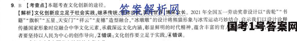 9.B【考查点】本题考查文化创新的途径【解析】文化创新应立足于社会实践,继承传统、推陈出新,面向世界、博采众长。2021年全国五一劳动奖章设计以“齿轮”“书籍”“旗帜”“五星、天安门”“祥云”“麦穗”造型融合,“冰墩墩”的设计将熊猫形象与冰雪运动巧妙结合,启示我们以设计诠释传播国家形象时应融合中华文化元素,承载深远文化内涵,彰显鲜明的时代精神,蕴含丰富的育人价值,①③正确:文化工作者要坚持以人民为中心的创作导向,②错误:文化创作要立足于实践,④错误。